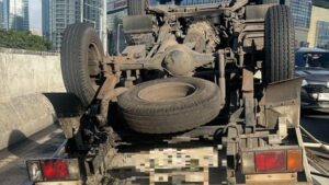 Kecelakaan tunggal melibatkan sebuah truk pengangkut galon air mineral terjadi di Jalan Layang Non-Tol (JLNT) Kampung Melayu-Tanah Abang, Jakarta Selatan, Rabu (23/4/2025) sore. Truk tersebut